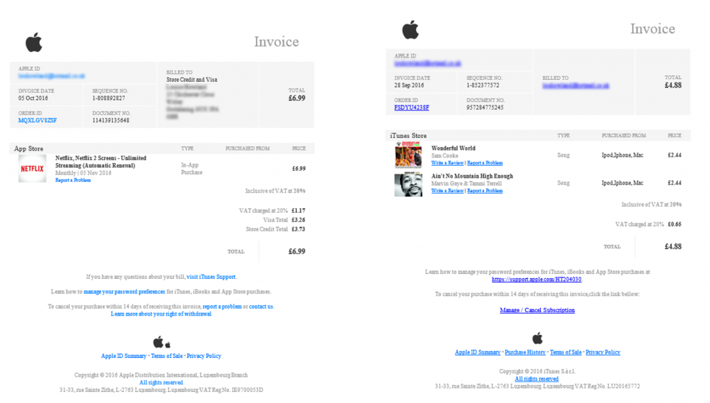 On the left is the real invoice from Apple and on the right is the phishing email. On the surface they look very similar but I found nine differences.