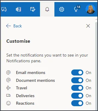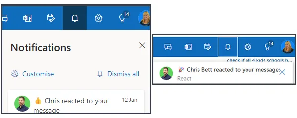 When someone reacts to an email you have sent you will be able to see this is two different places. Firstly, it will appear within your notifications feed in the top right-hand corner of your Outlook screen (the little bell icon).
